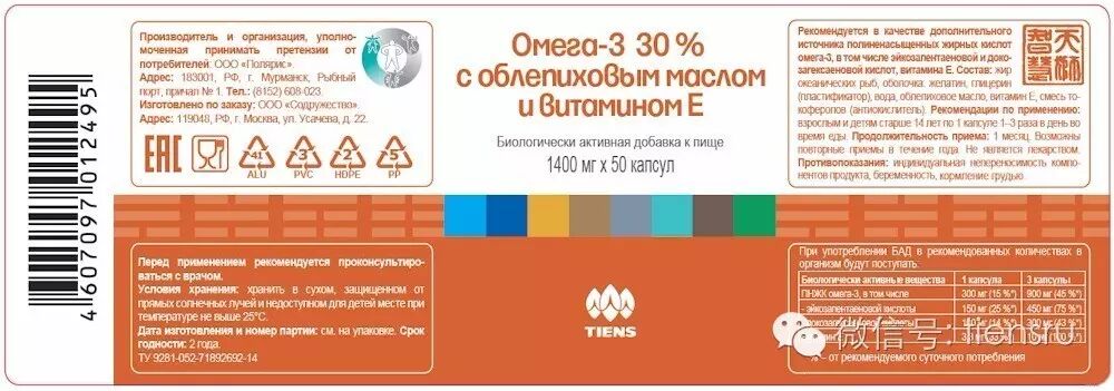 Базовыми элементами этикетки продукта является логотип «Тяньши», а также логотип, обозначающий БАДы компании. В данном случае это графическое изображение трех людей, символизирующих взаимосвязь очищения с регуляцией и питанием.