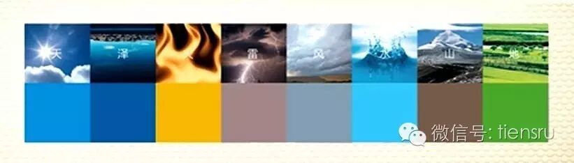 У «Тяньши» это: небо, озеро, огонь, гроза, ветер, вода, гора, земля. Так, это небесный голубой, голубое озеро, горячий огонь, золотой гром, свежий ветер, прозрачная вода, гора, зеленая земля. Подобная гармония символов также обозначает и гармонию в семье.